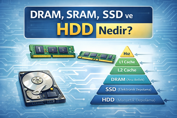 DRAM, SRAM, SSD ve HDD Nedir?Bilgisayarda veri farklı hız ve maliyet seviyelerinde saklanır.Tüm bellek türleri aynı değildir.Sistem genel olarak şu...