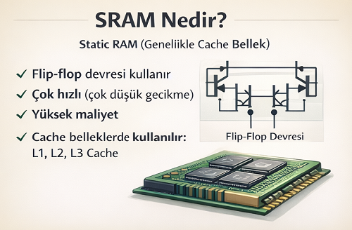 SRAM (Static RAM) genellikle işlemci içindeki cache bellektir.