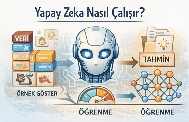 Yapay zeka, bilgisayarların tek tek kurallar yazılmadan, örneklerden öğrenerek tahmin veya karar üretmesini sağlar. Sistem, kendisine gösterilen verilerdeki ortak örüntüleri yakalar ve benzer durumlarda benzer çıktılar vermeye çalışır.