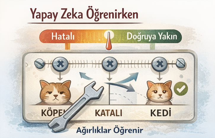 Sistem her denemede bir tahmin üretir, bu tahminin ne kadar hatalı olduğunu ölçer ve iç ayarlarını bu hatayı azaltacak şekilde değiştirir. Zamanla bu ayarlar, hangi girdinin hangi çıktıya daha uygun olduğunu temsil etmeye başlar.