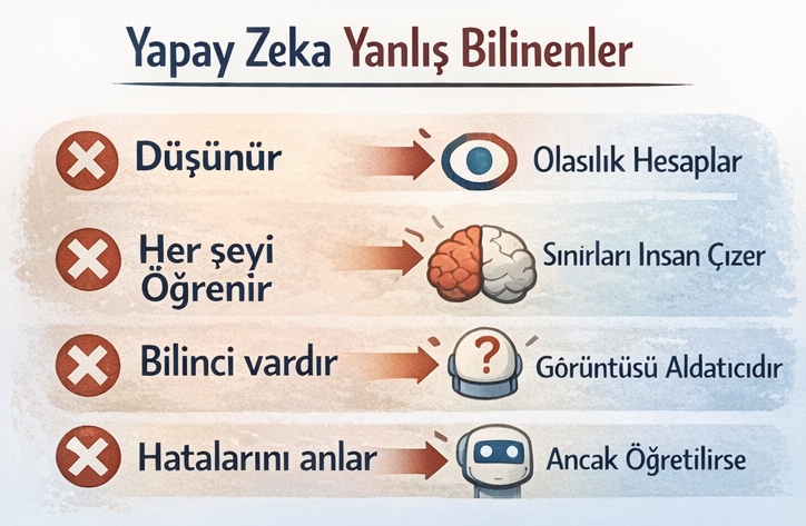 → Davranışı bilinçliymiş gibi görünür, kendisi değildir.❌ Hatalarını fark eder